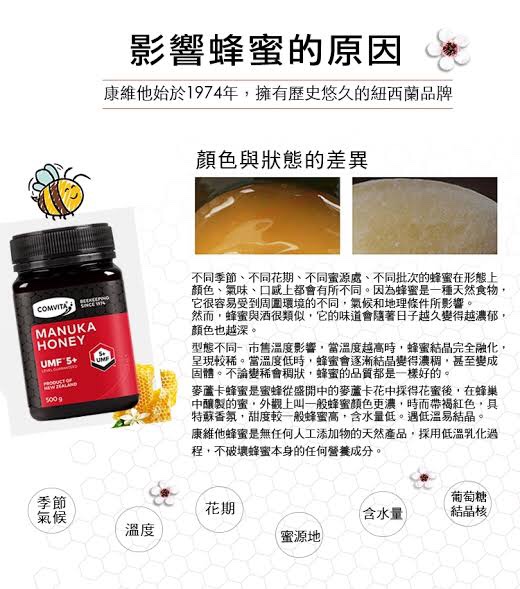 紐西蘭Comvita康維他「麥蘆卡花」的蜂蜜,含有高效及穩定的抗菌活性因子,營養價值極高,具極佳的保健。每天服用,有效增強消化系統、調理呼吸道不適、抗菌療傷等,可提升人體免疫力,維持腸胃健康,回復肌膚彈性、光澤感。
